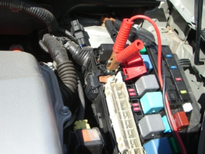 ※ハイブリッド車や電気自動車は補機用バッテリーがリヤシートの下やラゲージルームなどにありますがボンネット内にあるヒューズボックスの中にある救援端子にケーブルを接続します。