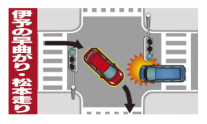 松本走り、伊予の早曲がり、茨城ダッシュとは右折の際、強引に直進車より先に進行する危険な運転です。