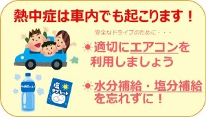 エアコンを使っていても直射日光や反射熱、後部座席までエアコンの風が届かない、隠れ脱水だと熱中症になることがあります。