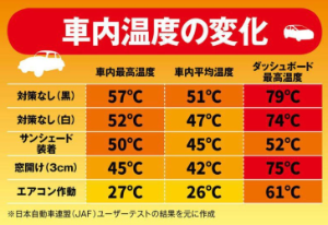・真夏の炎天下の車内はエンジンを停止後、わずか30分で約45℃になることもあります
