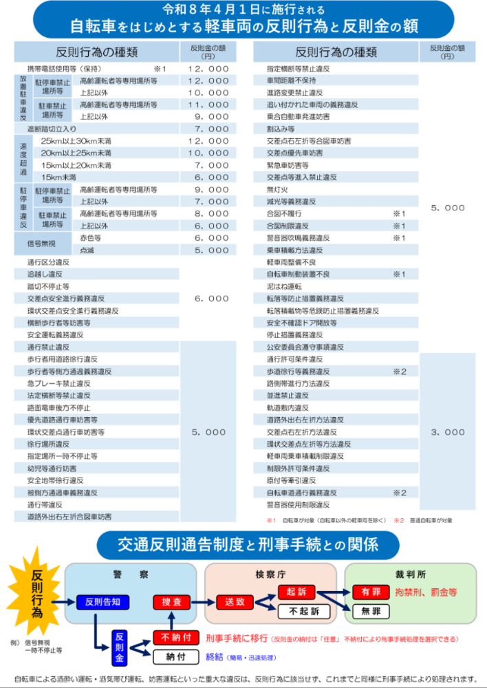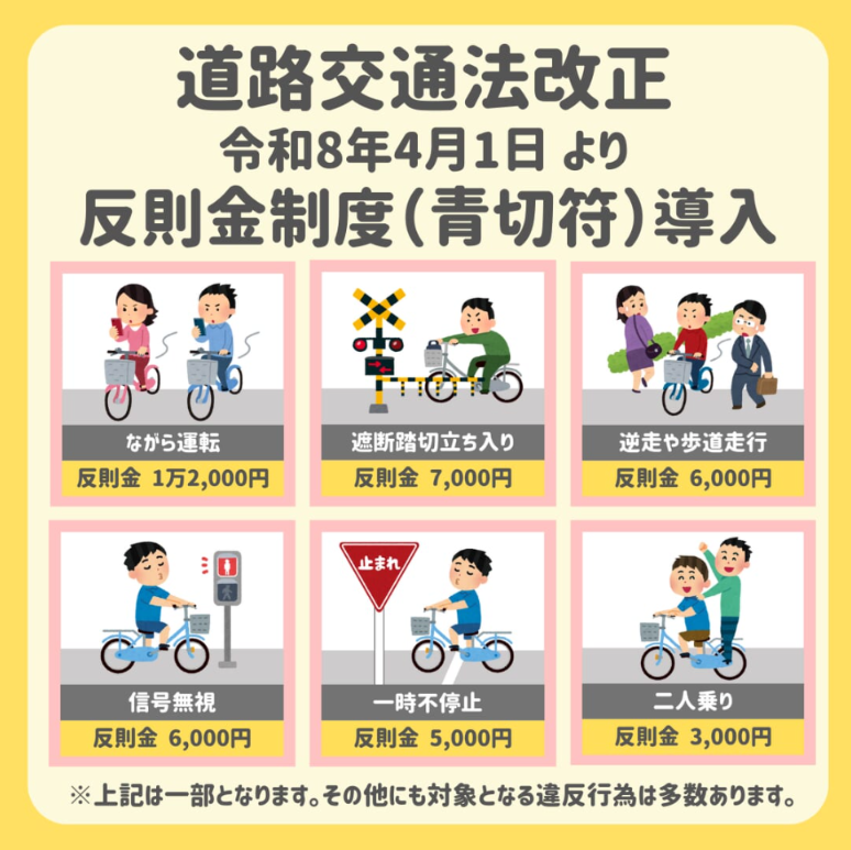 16歳以上の自転車運転者の違反につきまして2026年4月1日から新しいルールに改正され厳しくなりますので高校生のお子様がいらっしゃるご家庭などは特にご注意ください。